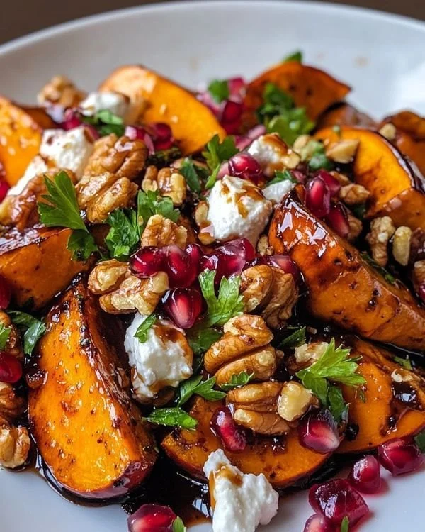 In a large bowl, mix roasted sweet potatoes, crumbled goat cheese, walnuts, and pomegranate seeds.